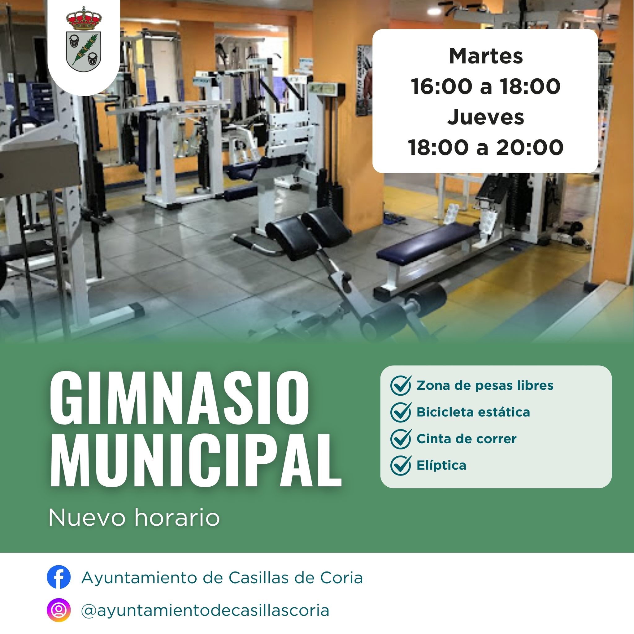 Horario de gimnasio actualizado 12 febrero 2025 ¿ Martes: 16:00 - 18:00 ¿ Jueves: 18:00 - 20:00 Horarios sujetos a ajustes. Podrían modificarse en función de la demanda de los usuarios. Consulta nuestras redes para futuras actualizaciones.
