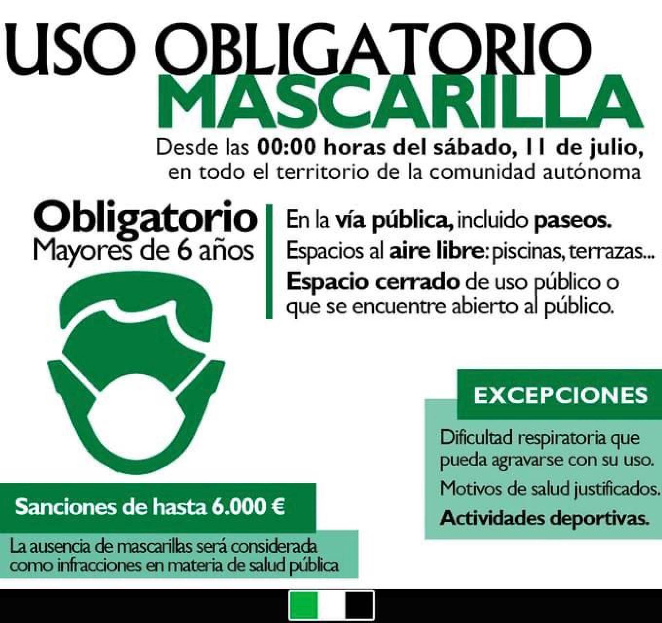 Desde las 00:00 horas del sábado, 11 de julio, en todo el territorio de la Comunidad Autónoma de Extremadura, será obligatorio el uso de mascarilla. La ausencia de mascarillas será considerada como infracciones en materia de salud pública con sanciones de hasta 6.000€.