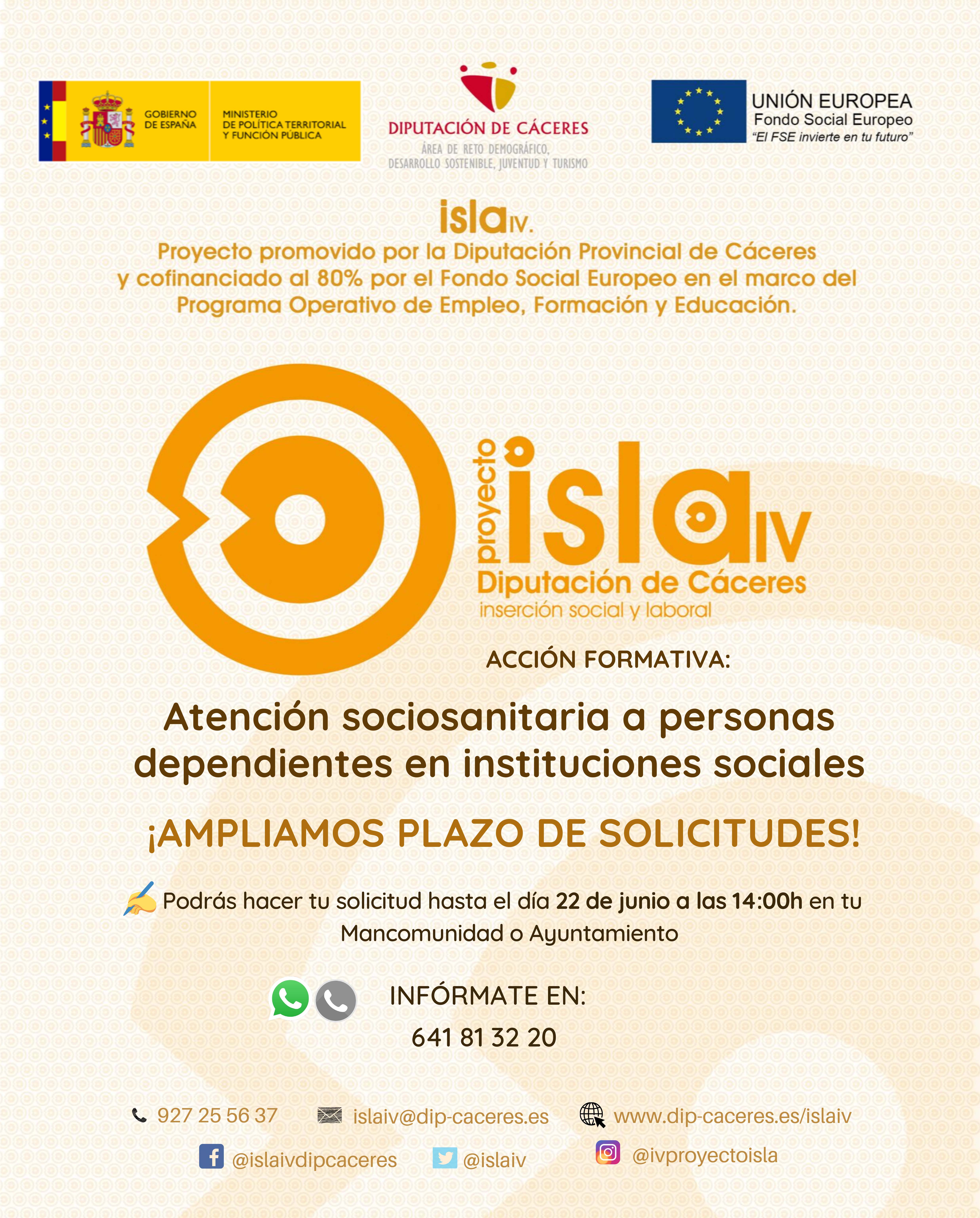 El Ayuntamiento de Casillas de Coria informa sobre la ampliación de plazo de solicitudes hasta el día 22 de junio de 2020 a las 14:00 horas, para la acción formativa "Atención Sociosanitaria a personas dependientes en Instituciones Sociales".