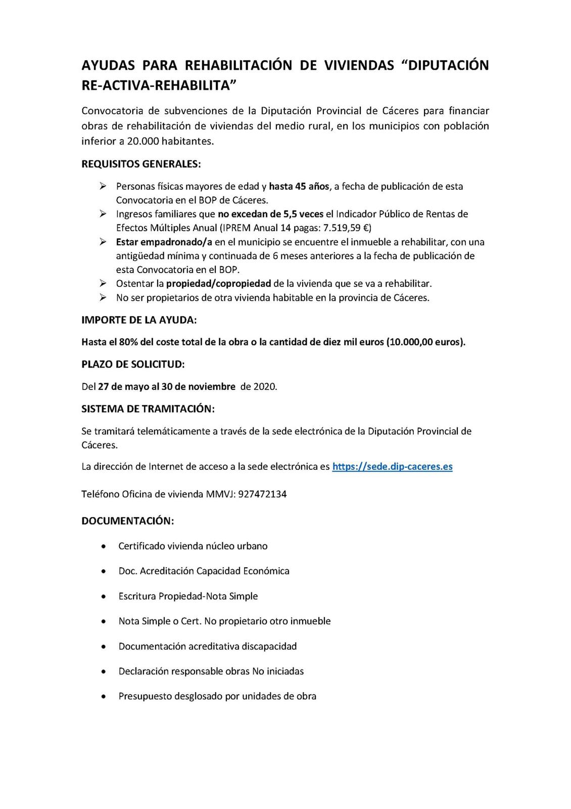 El Ayuntamiento de Casillas de Coria informa sobre la convocatoria de subvenciones de la Diputación Provincial de Cáceres para financiar obras de rehabilitación de viviendas del medio rural, en los municipios con población inferior a 20.000 habitantes.