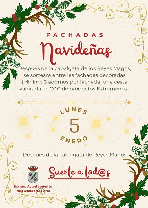Fachadas navideñas 19 diciembre 2025 Lunes 5 de Enero Después de la Cabalgata Mínimo 3 adornos por fachada 70€ en productos Extremeños